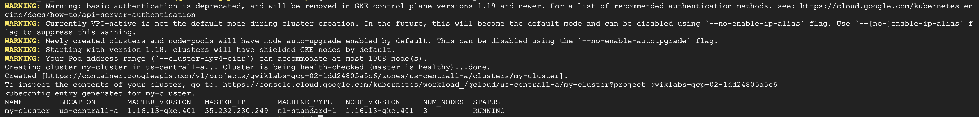 클러스터를 생성하고 나면 클러스터의 NAME, LOCATION, MASTER_VERSION, MASTER_IP, MACHINE_TYPE, NODE_VERSION, NUM_NODES, STATUS 정보가 콘솔창에 출력됩니다. 제가 생성한 클러스터의 노드 수는 3이고 현재 RUNNING 상태라는 것을 알 수 있습니다.
