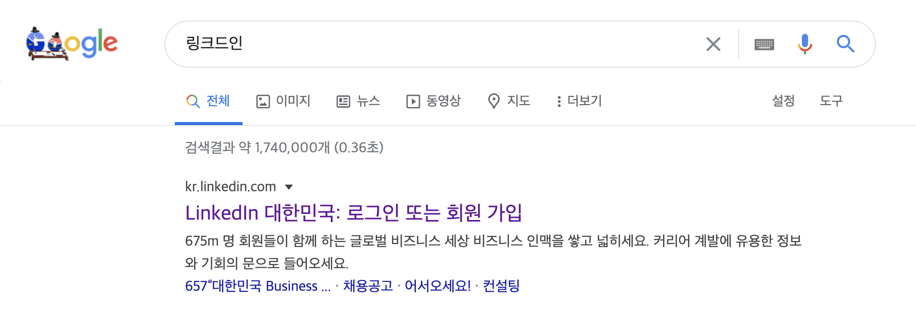 방금 전에 링크드인 홈페이지에 접속하기 위해 구글에 '링크드인'이라고 검색했다. 그리고 맨 위에 뜨는 홈페이지를 클릭했다.