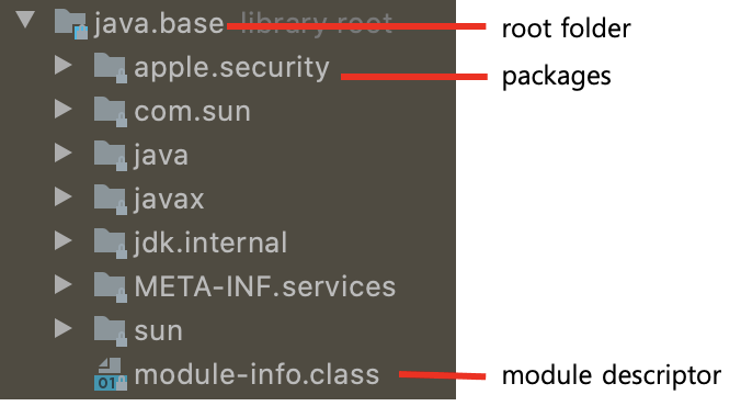 module descriptor는 모듈의 정보를 담는 메타데이터로, 모듈을 정의하고 모듈의 의존성과 내보내거나 사용하는 패키지들, 제공하거나 소비하는 서비스들을 명시하는 곳입니다. module-info.java 라는 이름의 파일을 컴파일한 module-info.class 파일이 바로 module descriptor입니다. 이 module descriptor는 최상위 폴더에 위치합니다.