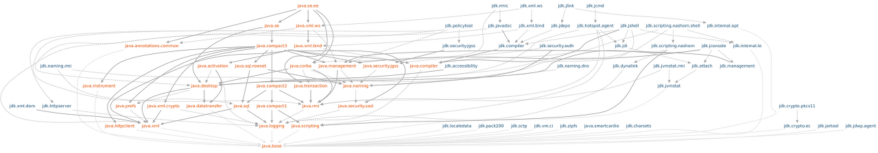 위에서 모듈들은 서로 의존 관계를 가질 수 있다고 했습니다. java.base 모듈은 기본적인 API들이 있는 모듈인 만큼 다른 모듈에 의존하지 않고, 다른 모듈들은 아래의 그래프와 같이 명시적 또는 암묵적으로 java.base 모듈에 의존합니다. 명시적으로 의존한다는 것은 module configuration 파일에 다른 모듈을 의존한다고 명시했다는 뜻이고, 암묵적으로 의존한다는 것은 의존하는 모듈이 의존하는 모듈을 직접 명시하지 않아도 자동으로 의존되게끔 설정되었을 경우를 말합니다.